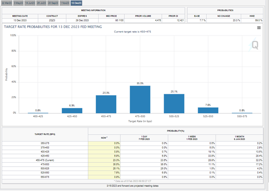 即使美联储官员都发布相对鹰派讲话,可是,从CME Fedwatch工具和近期美元的反弹幅度来看,市场仍预期2023年底有近70%的概率美联储将会把利率降至5%的峰值以下。